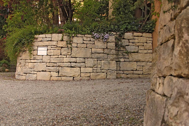 Ohne Beton oder Mörtel aufeinanderschichtete Mauer aus Jurakalk-Steinen. Die Mauersteine sind alle von Hand nachbearbeitet. Bei der Hinterfüllung solcher Mauern ist auf eine gute Wasserdrainage zu achten.